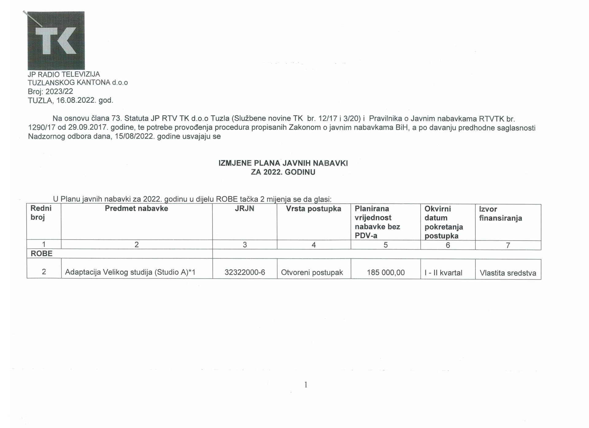 Ponovljeni Javni konkurs za izbor i imenovanje predsjednika i članova odbora za reviziju u JP RTV TK doo.