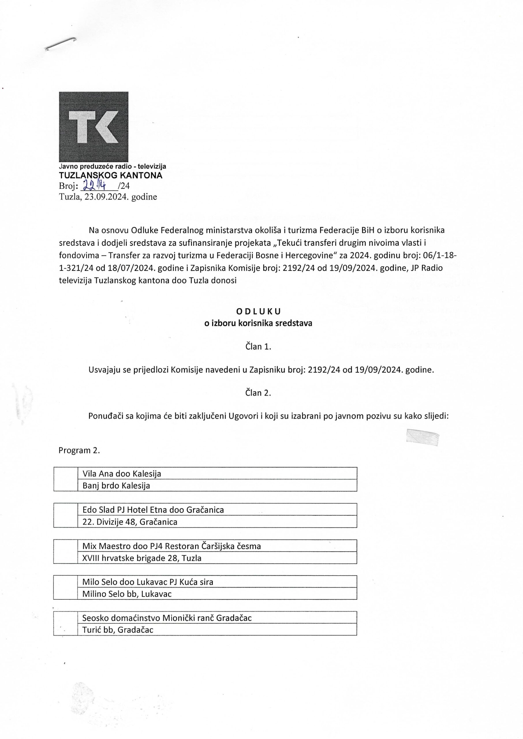 (24.09.2024.) Odluka o izboru korisnika Projekta ”Naša zemlja naša priča”