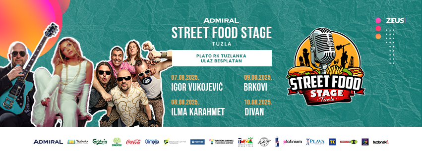„Admiral Street Food Stage“ otvaramo 7. augusta koncertom Igora Vukojevića, koji garantuje odličnu energiju i sjajnu zabavu na samom početku festivala. Drugi dan „Admiral Street Food Stagea“ rezervisan je za nastup sjajne Ilme Karahmet, bosanskoherecgovačke pjevačke zvijezde, koja osvaja publiku, svojim neponovljivim interpretacijama. Trećeg dana festivala 8. augusta u Tuzli nastupa hrvatski folk – punk – rock sastav „Brkovi“ . Udaljene žanrove su duhovito spojili u melodioznu cjelinu i Tuzlacima obećavaju odličnu zabavu, mnogo smijeha, ali i čvrstog zvuka. Njihovi nastupi su vrlo originalni i publiku nikada ne ostavljaju ravnodušnom.