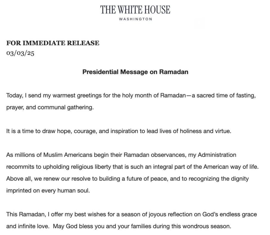 “Dok milioni Amerikanaca muslimana započinju obilježavanje ramazana, moja administracija se ponovo obavezuje da će podržavati vjersku slobodu koja je uveliko sastavni dio američkog načina života. Iznad svega, obnavljamo našu odlučnost da izgradimo budućnost mira i da priznamo dostojanstvo koje je utisnuto u svaku ljudsku dušu”, poručio je Trump i dodao: