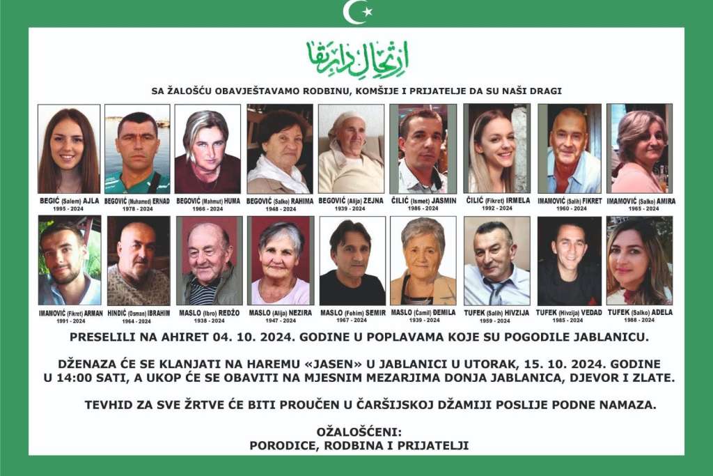 Dženaza namaz klanjan je za 19 nastradalih osoba: Begić (Salem) Ajla 1995-2024., Begović (Muhamed) Ernad 1978-2024., Begović (Mahmut) Huma 1966-2024., Begović (Salko) Rahima 1948-2024., Begović (Alija) Zejna 1939-2024., Čilić (Ismet) Jasmin 1986-2024., Čilić (Fikret) Irmela 1992-2024., Imamović (Salih) Fikret 1960-2024., Imamović (Salko) Amira 1965-2024., Imamović (Fikret) Arman 1991-2024., Hindić ( Osman) Ibrahim 1964-2024., Maslo (Ibro) Redžo 1938-2024., Maslo (Alija) Nezira 1947-2024., Maslo (Fehim) Semir 1967-2024., Maslo (Ćamil) Đemila 1939-2024., Tufek (Salih) Hivzija 1959-2024., Tufek (Hivzija) Vedad 1975-2024., Tufek (Salko) Adela 1988-2024., te žrtvu čije je tijelo pronađeno u ponedjeljak.